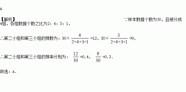 已知样本数据个数为30,且被分成4组,各组数据个数之比为2:4:3:1,则第二小组、第三小组的频率分别是( )