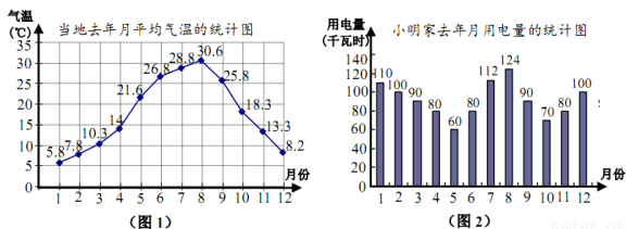 小明为了了解气温对用电量的影响,对去年自己家的每月用电量和当地气温进行了统计.当地去年每月的平均气温如图1,小明家去年月用电量如图2.