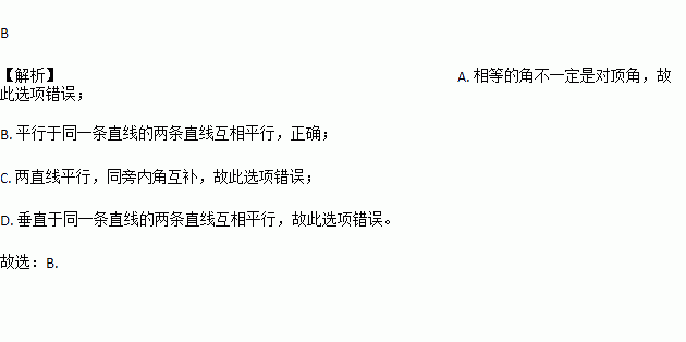 A. 相等的角是对顶角 B. 平行于同一条直线的两条直线互相平行