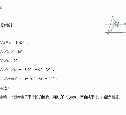 如图,直线m∥n,△ABC的顶点B,C分别在直线n,m上,且∠ACB=90°,若∠1=40°,则∠2的度数为