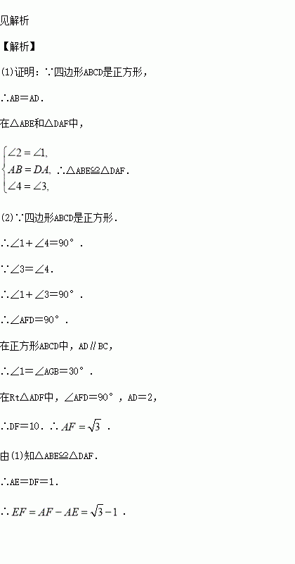 如图,四边形ABCD是边长为2的正方形,点G是BC延长线上一点,连接AG,点E、F分别在AG上,连接BE、DF,∠1=∠2,∠3=∠4.