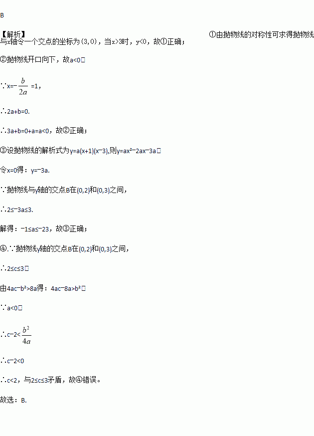 如图,已知二次函数y=ax2+bx+c(a≠0)的图象与x轴交于点A(﹣1,0),对称轴为直线x=1,与y轴的交点B在(0,2)和(0,3)之间(包括这两点),下列结论:①当x>3时,y<0;②3a+b<0;③﹣1≤a≤﹣