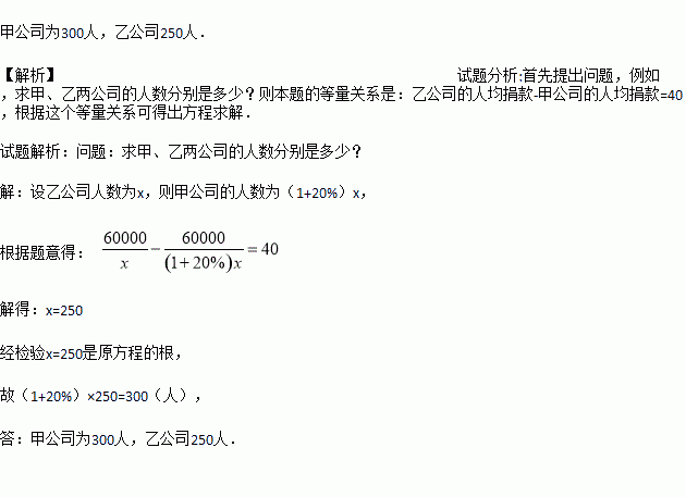 甲、乙两公司为“见义勇为基金会”各捐款60000元,已知乙公司比甲公司人均多捐40元,甲公司的人数比乙公司的人数多20%.