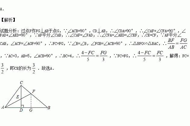 如图,在Rt△ABC中,∠ACB=90°,CD⊥AB,垂足为D,AF平分∠CAB,交CD于点E,交CB于点F.若AC=3,AB=5,则CE的长为( )