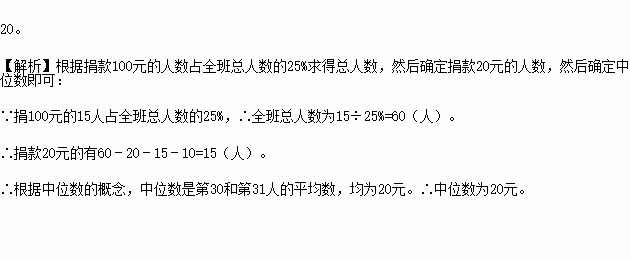 在某公益活动中,小明对本班同学的捐款情况进行了统计,绘制成如图不完整的统计图.其中捐100元的人数占全班总人数的25%,则本次捐款的中位数是 元.