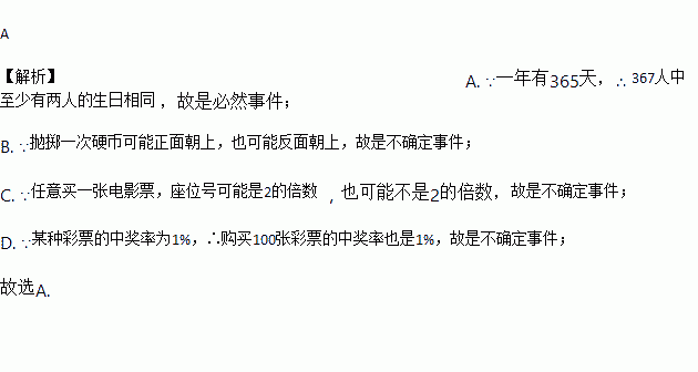 A. 367人中至少有两人的生日相同 B. 抛掷一次硬币正面朝上
