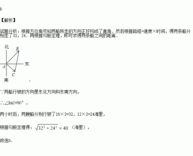 已知,如图,一轮船以16海里/时的速度从港口A出发向东北方向航行,另一轮船以12海里/时的速度同时从港口A出发向东南方向航行,离开港口2小时后,则两船相距( )