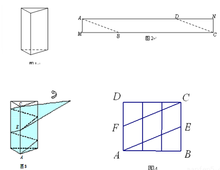 如图1是一个三棱柱包装盒,它的底面是边长为10cm的正三角形,三个侧面都是矩形.现将宽为15cm的彩色矩形纸带AMCN裁剪成一个平行四边形ABCD(如图2),然后用这条平行四边形纸带按如图3的方式把这个三棱柱包装盒的侧面进行包贴(要求包贴时没有重叠部分),纸带在侧面缠绕三圈,正好将这个三棱柱包装盒的侧面全部包贴满.在图3中,将三棱柱沿过点A的侧棱剪开,得到如图4的侧面展开图.为了得到裁剪的角度,我们可以根据展开图拼接出符合条件的平行四边形进行研究.