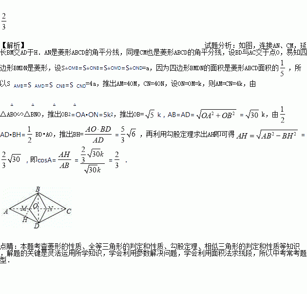 如图,菱形ABCD内两点M、N,满足MB⊥BC,MD⊥DC,NB⊥BA,ND⊥DA,若四边形BMDN的面积是菱形ABCD面积的