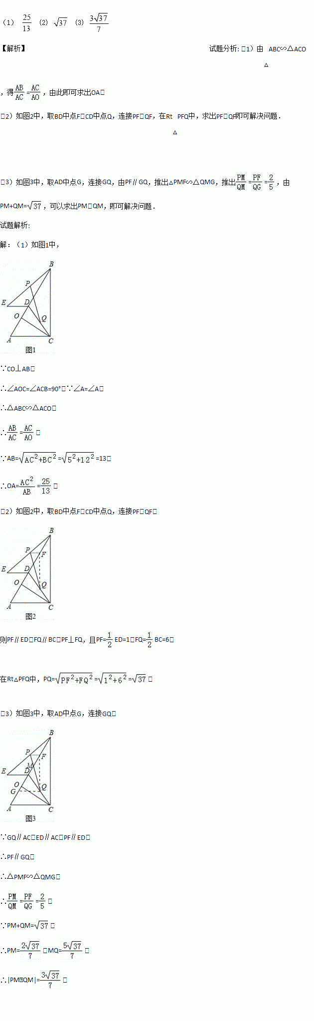 如图,△ABC中,∠ACB=90°,AC=5,BC=12,CO⊥AB于点O,D是线段OB上一点,DE=2,ED∥AC(∠ADE<90°),连接BE、CD.设BE、CD的中点分别为P、Q.