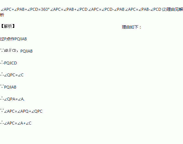 (10分)如图,已知AB∥CD,分别探究下面四个图形中∠APC和∠PAB、∠PCD的关系,并从所得的四个关系中任选一个加以说明,证明所探究的结论的正确性。