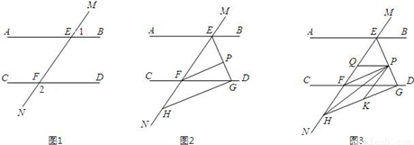 如图1,直线MN与直线AB、CD分别交于点E、F,∠1与∠2互补.