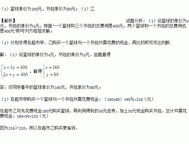 (2)某一天小文上街,恰好赶上商家促销,超市甲所有商品打九折销售,超市乙全场购物满100元返30元购物券(不足100元不返券,购物券全场通用),如果他只能在同一家超市购买他看中的篮球和书包各一个,应选择哪一家超市购买更省钱?并说明理由.