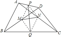 分析 (1)连接MP、NP、MQ、NQ,根据三角形中位线定理得到PM=$\frac{1}{2}$AB,PM∥AB,NQ=$\frac{1}{2}$AB,NQ∥AB,根据平行四边形的判定定理证明四边形PMQN是平行四边形,根据平行四边形的性质定理证明结论;