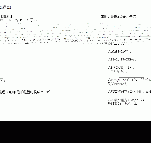 ,0)、(0,5),点D在第一象限,且∠ADB=60º,则线段CD的长的最小值为______.