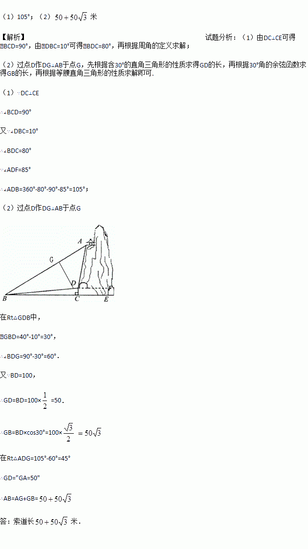 某旅游区有一个景观奇异的望天洞,D点是洞的入口,游人从入口进洞游览后,可经山洞到达山顶的出口凉亭A处观看旅游区风景,最后坐缆车沿索道AB返回山脚下的B处.在同一平面内,若测得斜坡BD的长为100米,坡角∠DBC=10°,在B处测得A的仰角∠ABC=40°,在D处测得A的仰角∠ADF=85°,过D点作地面BE的垂线,垂足为C.
