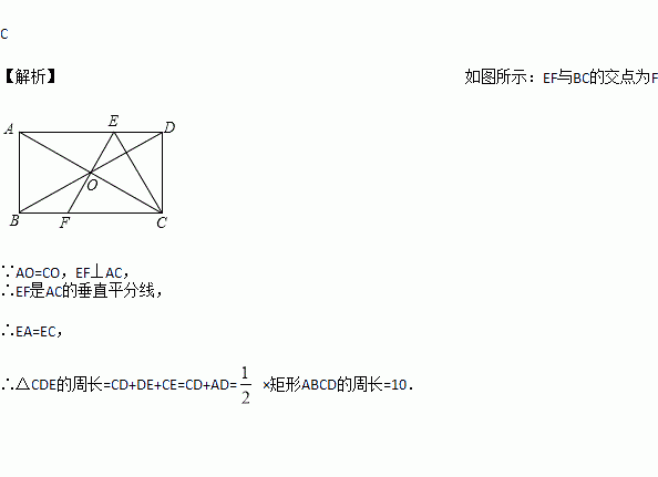 如图,在□ABCD中,O是AC,BD的交点,过点O与AC垂直的直线交边AD于点E,若□ABCD的周长20厘米,则△CDE的周长为( )