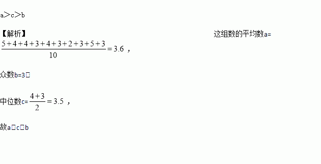 数据5,4,4,3,4,3,2,3,5,3的平均数为a,众数为b,中位数为c,则a、b、c的大小关系是____________________。