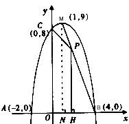 | 解:(1)由根与系数的关系,得 ∵(x1+x2)﹣x1x2=10, ∴m+4m=10,m=2, ∴二次函数的解析式为y=-x2+2x+8; (2)由-x2+2x+8=0,解得x1=-2,x2=4, y=-x2+2x+8=-(x-1)2+9, ∴B,C,M的坐标分别为B(4,0),C(0,8),M(1,9); (3)如图,过M作MN⊥x轴于N,则ON=1,MN=9,OB=4,BN=3, ∵OH=t(1<t<4), ∴BH=4-t, 由PH∥MN,可求得PH=3BH=3(4﹣t), ∴S= S=- ∵1< ∴当t= |