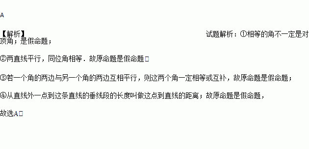 有下列四个命题:①相等的角是对顶角;②同位角相等;③若一个角的两边与另一个角的两边互相平行,则这两个角一定相等;④从直线外一点到这条直线的垂线段,叫做点到直线的距离。其中是真命题的个数有( )