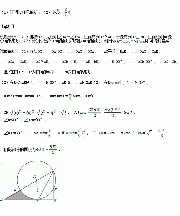 (2)若AE=6,∠D=30°,求图中阴影部分的面积.