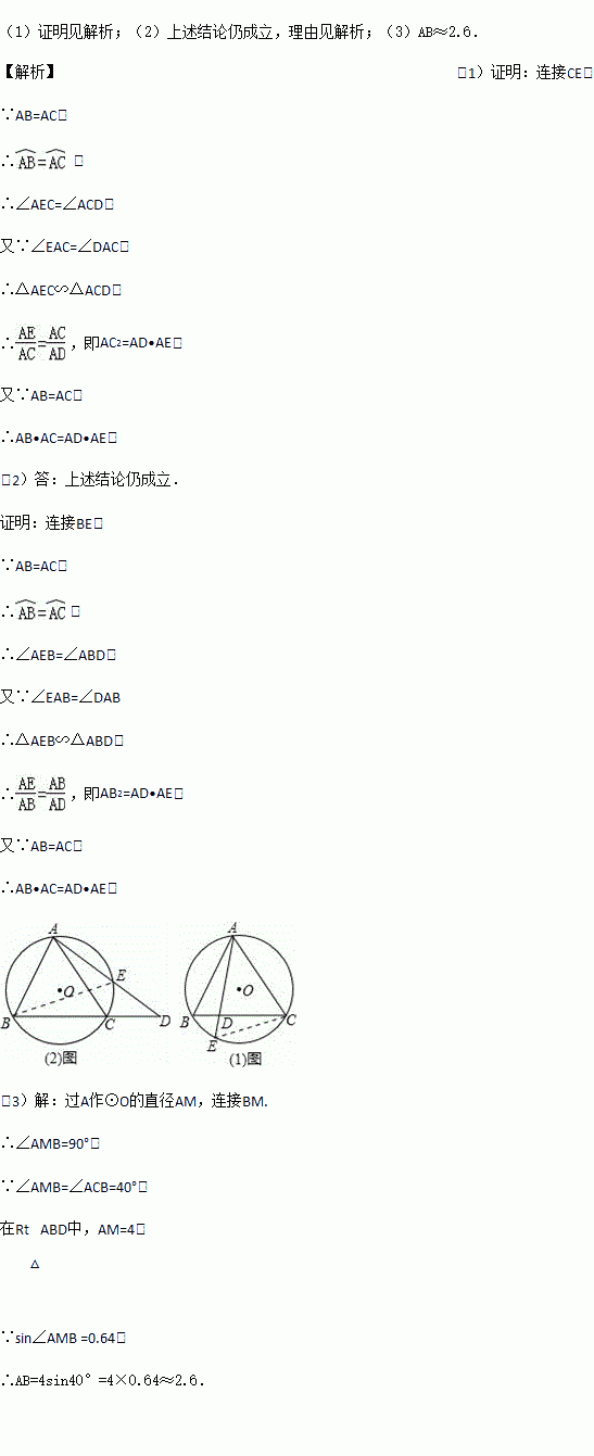 (2)在(1)的条件下当弦AE的延长线与BC的延长线相交于点D时,上述结论是否还成立?若成立,请给予证明.若不成立,请说明理由.