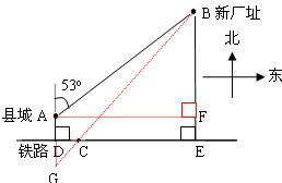 Èçͼ£¬Ä³ÏسÇA¾à¶«Î÷×ßÏòµÄÒ»ÌõÌú·£¨Í¼ÖÐDE£©10km£¬ÏØÕþ¸®Îª¸ÄÉÆ³ÇÊÐÈ˾ӻ·¾³£¬¾ö¶¨½«³ÇÄÚÒ»»¯¹¤³§Ç¨ÖÁ¾àÏØ³Ç50km£¬·½Î»ÎªËüµÄ±±Æ«¶«53oµÄB´¦£¨Ð³§Ö·£©¡£