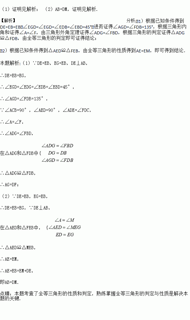 如图一,∠ACB=90°,点D在AC上,DE⊥AB垂足为E,交BC的延长线于F,DE=EB,EG=EB,