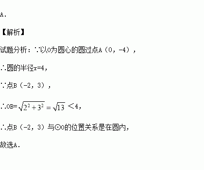 在平面直角坐标系中,以O为圆心的圆过点A(0,-4),则点B(-2,3)与⊙O的位置关系是( )