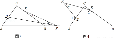 (4)若点P运动到△ABC形外,如图(4)所示,则∠α、∠1、∠2之间的关系为: .
