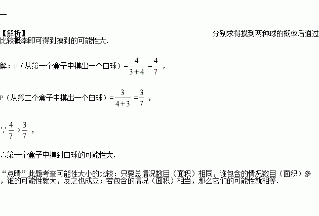 有两个盒子,第一个盒子中装有3 个红球和4 个白球,第二个盒子中装有4 个红球和 3 个白球,这些球除颜色外都相同,分别从中摸出1 个球,从第 ______个盒子中摸到白球的可能性大.