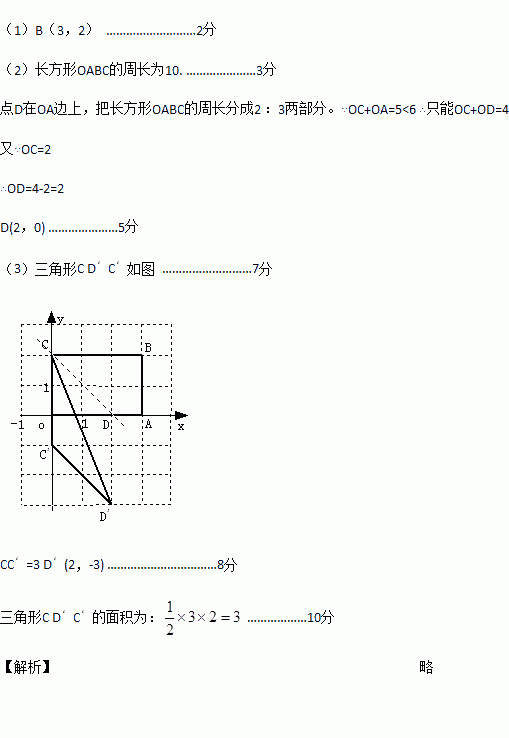 (2)若过点C的直线交长方形的OA边于点D,且把长方形OABC的周长分成2∶3的两部分,求点D的坐标;