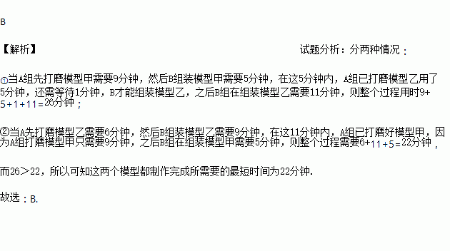 手工课上,老师将同学们分成A,B两个小组制作两个汽车模型,每个模型先由A组同学完成打磨工作,再由B组同学进行组装完成制作,两个模型每道工序所需时间如下: