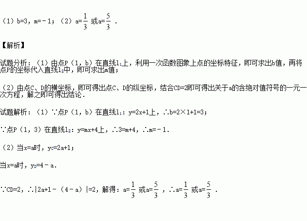 如图,直线l1:y=2x+1与直线l2:y=mx+4相交于点P(1,b).