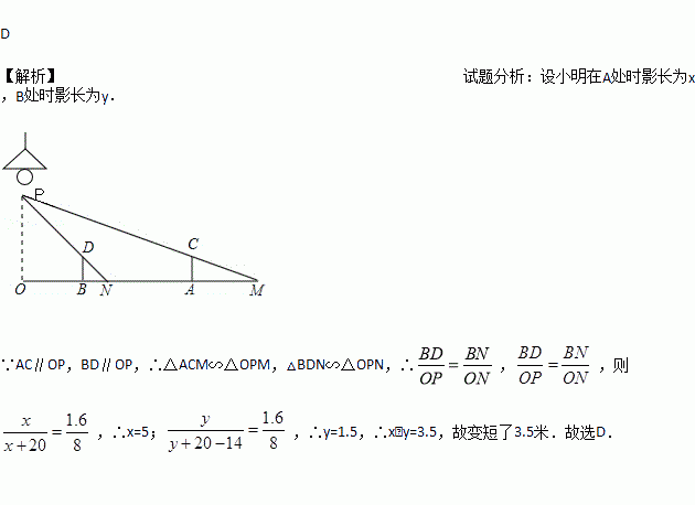 如图,路灯OP距地面8米,身高1.6米的小明从距离灯的底部(点O)20米的点A处,沿OA所在的直线行走14米到点B处时,人影的长度( )