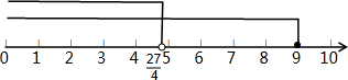 解答 解:解不等式$\frac{x-6}{3}<\frac{1}{4}$,得:x<$\frac{27}{4}$,解不等式3(x-6)≤9,得:x≤9,∴不等式组的解集为:x<$\frac{27}{4}$,将不等式解集表示在数轴上如图: