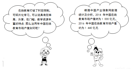 “在线教育”指的是通过应用信息科技和互联网技术进行内容传播和快速学习的方法.“互联网+”时代,中国的在线教育得到迅猛发展. 请根据下面张老师与记者的对话内容,求2014年到2016年中国在线教育市场产值的年平均增长率.