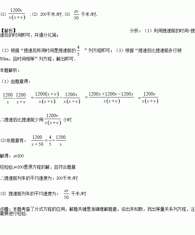 (2)若v=50,行驶1200km的路程,提速后所用时间是提速前的