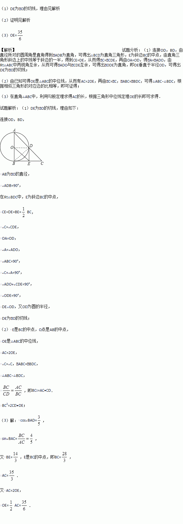 如图,在△ABC中,∠ABC=90°,以AB的中点O为圆心,OA为半径的圆交AC于点D,E是BC的中点,连接DE,OE.