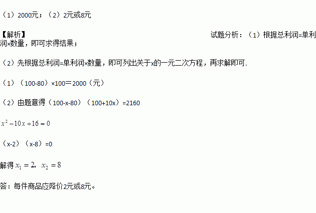 (2)设后来该商品每件降价x元,若商场经营该商品一天要获利润2160元,则每件商品应降价多少元?