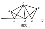 (2)如图②,D、E是D、A、E三点所在直线m上的两动点(D、A、E三点互不重合),点F为∠BAC平分线上的一点,且△ABF和△ACF均为等边三角形,连接BD、CE,若∠BDA=∠AEC=∠BAC,试判断△DEF的形状.并说明理由.
