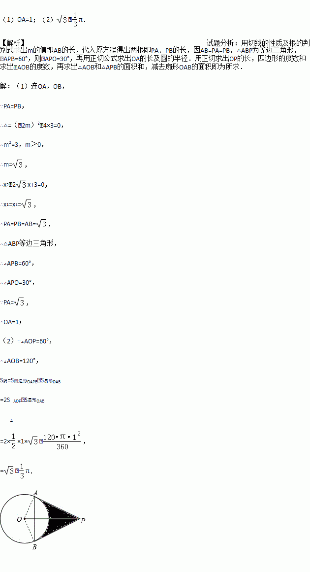 (2015秋•黄山期末)如图,已知PA、PB切⊙O于A、B两点,连AB,且PA,PB的长是方程x2﹣2mx+3=0的两根,AB=m.试求: