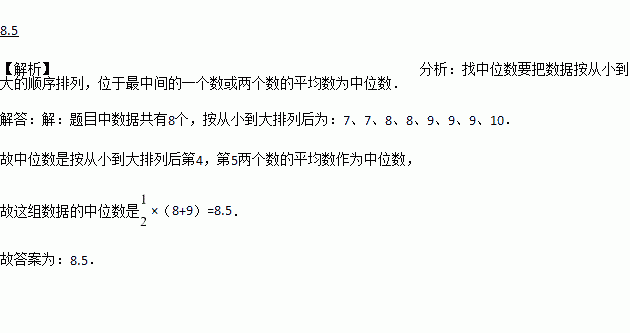 在一次信息技术考试中,某兴趣小组8名同学的成绩(单位:分)分别是:7,10,9,8,7,9,9,8, 则这组数据的中位数是_________.
