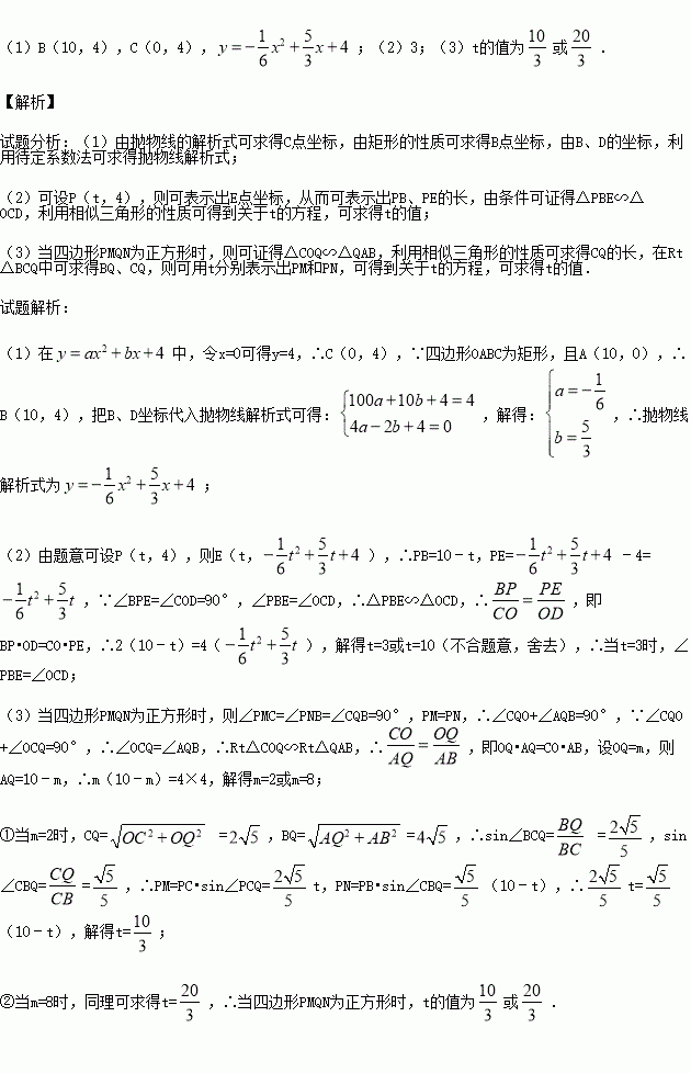 (3)点Q是x轴上的动点,过点P作PM∥BQ,交CQ于点M,作PN∥CQ,交BQ于点N,当四边形PMQN为正方形时,请求出t的值.