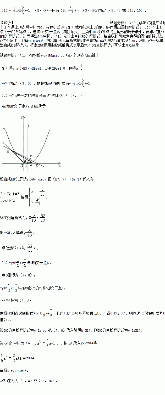 与x轴交于点D,与抛物线m的对称轴l交于点F,过B点的直线BE与直线n相交于点E(﹣7,7).