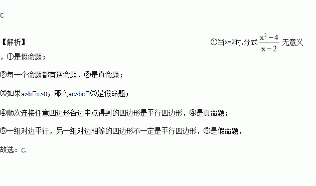 的值为零;②每一个命题都有逆命题;③如果a>b,那么ac>bc;④顺次连接任意四边形各边中点得到的四边形是平行四边形;⑤一组对边平行,另一组对边相等的四边形是平行四边形.