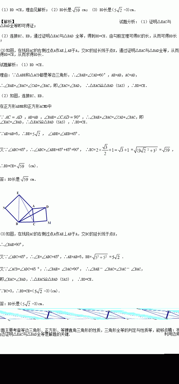 (2)如图2,△ABC中,∠ABC=45°,AB=5cm,BC=3cm,分别以AB、AC为边向外作正方形ABNE和正方形ACMD,连接BD,求BD的长.
