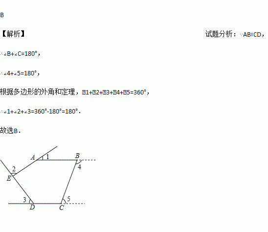 如图,五边形ABCDE中,AB∥CD,∠1、∠2、∠3分别是∠BAE、∠AED、∠EDC的外角,则∠1+∠2+∠3等于( )