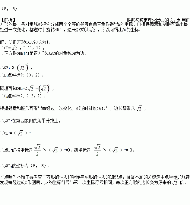 如图,在平面直角坐标系中有一个边长为1的正方形OABC,边OA,OC分别在x轴、y轴上,如果以对角线OB为边作第二个正方形OBB1C1,再以对角线OB1为边作第三个正方形OB1B2C2,…,照此规律作下去,则点B6的坐标为_____.