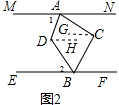分析 (1)如图1,根据平行线的性质得到∠1=∠ADH,∠2=∠BDH,∠MAC=∠ACG,∠EBC=∠BCG,根据角平分线的定义得到∠1=$\frac{1}{2}∠$ACG,∠2=$\frac{1}{2}∠BCG$,即可得到结论;